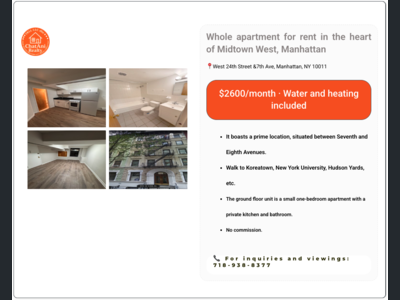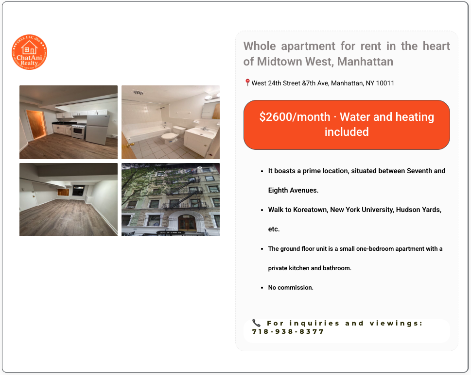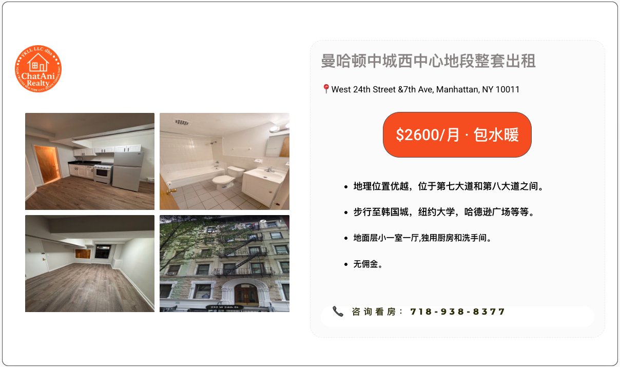 曼哈顿Chelsea整套小一室一厅公寓出租_$2600/月包水暖